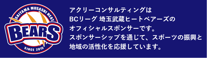 アクリーコンサルティングはプロ野球BCリーグ「埼玉武蔵ヒートベアーズ」のオフィシャルスポンサーとして、同球団関係者の皆様を応援しております。